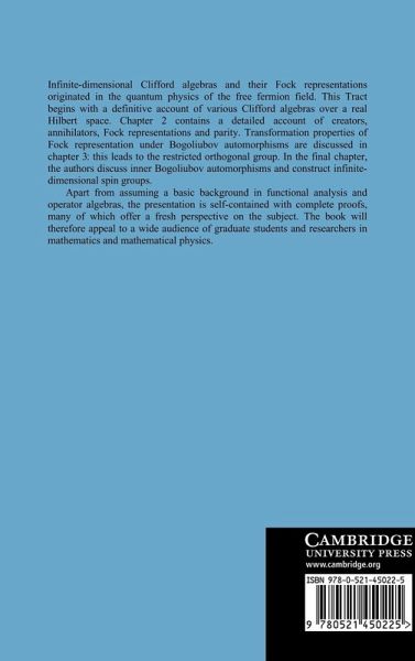 Infinite-dimensional Clifford algebras and their Fock representations originated in the quantum physics of the free fermion field. This Tract begins with a definitive account of various Clifford algebras over a real Hilbert space. Chapter 2 contains a detailed account of creators, annihilators, Fock representations and parity. Transformation properties of Fock representation under Bogoliubov automorphisms are discussed in chapter 3: this leads to the restricted orthogonal group. In the final chapter the authors discuss inner Bogoliubov automorphisms and construct infinite-dimensional spin groups. Apart from assuming a basic background in functional analysis and operator algebras, the presentation is self-contained with complete proofs, many of which offer a fresh perspective on the subject. The book will therefore appeal to a wide audience of graduate students and researchers in mathematics and mathematical physics.