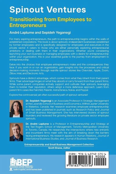 Whether you're considering launching your own business or managing spinout ventures within your organization, this is your essential guide to the journey from employment to entrepreneurship. For many aspiring entrepreneurs, the path to entrepreneurship begins within the walls of established corporations. This book is uniquely tailored for employees and executives in the private sector either experiencing entrepreneurial ambitions, or dealing with them in their organizations. Whether you're considering launching your own business or managing spinout ventures within your organization, this is your essential guide to the journey from employment to entrepreneurship. Delve into the choices that employee entrepreneurs make and the consequences they face. If you work in or run an organization, gain insights into the processes and critical decision-making moments through real-life spinout stories like Chevrolet, Apple, Zoom, Zillow, Intel, and Electronic Arts. Spinouts have a distinct advantage, which comes from what they inherit from their parent firms. Their advantage hinges on what they absorb or carry forward from their parent firms. While some parent companies actively support and cultivate their spinouts, leveraging them to bolster their reputation, others adopt a more defensive approach. Learn from parent firm cases like Fairchild, Palantir, AstraZeneca, Nokia, and Paypal. Explore the controversial, yet often successful path of spinout ventures!