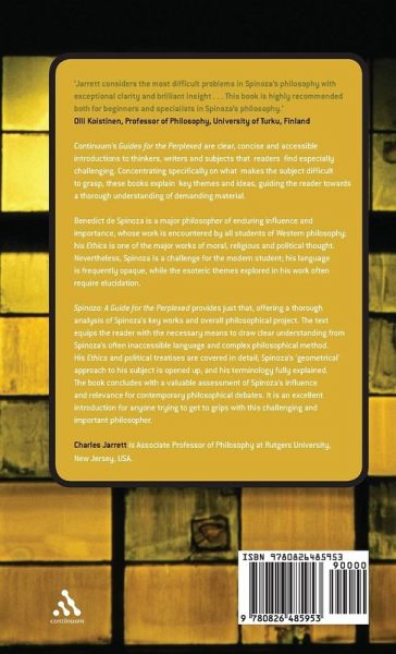 Continuum's Guides for the Perplexed are clear, concise and accessible introductions to thinkers, writers and subjects that students and readers can find especially challenging. Concentrating specifically on what it is that makes the subject difficult to fathom, these books explain and explore key themes and ideas, guiding the reader towards a thorough understanding of demanding material. Benedict de Spinoza is a major philosopher of enduring influence and importance, whose work is encountered by all serious students of Western philosophy; his Ethics is one of the seminal works of moral, religious and political thought. Nevertheless, Spinoza is a considerable challenge for the modern student; his language, rooted in the vocabulary of late medieval scholasticism is frequently opaque, while the esoteric themes explored in his work often require elucidation. Spinoza: A Guide for the Perplexed provides that elucidation, offering a thorough account and analysis of Spinoza's key works and overall philosophical project. The text equips the reader with the necessary means to draw full and clear understanding from Spinoza's often inaccessible language and complex philosophical system and method. His Ethics and political treatises are covered in detail; Spinoza's 'geometrical' approach to his subject is opened up, and his obscure terminology fully explained. The book concludes with a valuable assessment of Spinoza's enduring influence and his relevance for contemporary philosophical debates and concerns. It is an excellent support resource for anyone trying to get to grips with this challenging and important philosopher.