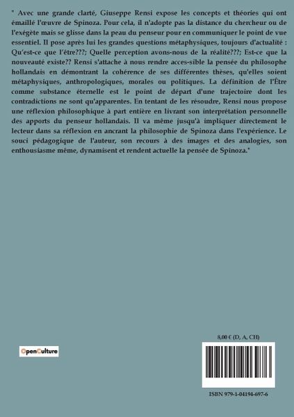 " Avec une grande clarté, Giuseppe Rensi expose les concepts et théories qui ont émaillé l'¿uvre de Spinoza. Pour cela, il n'adopte pas la distance du chercheur ou de l'exégète mais se glisse dans la peau du penseur pour en communiquer le point de vue essentiel. Il pose après lui les grandes questions métaphysiques, toujours d'actualité : Qüest-ce que l¿être???; Quelle perception avons-nous de la réalité???; Est-ce que la nouveauté existe?? Rensi s'attache à nous rendre accessible la pensée du philosophe hollandais en démontrant la cohérence de ses différentes thèses, qu'elles soient métaphysiques, anthropologiques, morales ou politiques. La définition de l'Être comme substance éternelle est le point de départ d'une trajectoire dont les contradictions ne sont qu'apparentes. En tentant de les résoudre, Rensi nous propose une réflexion philosophique à part entière en livrant son interprétation personnelle des apports du penseur hollandais. Il va même jusqu'à impliquer directement le lecteur dans sa réflexion en ancrant la philosophie de Spinoza dans l'expérience. Le souci pédagogique de l'auteur, son recours à des images et des analogies, son enthousiasme même, dynamisent et rendent actuelle la pensée de Spinoza."