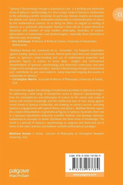 This book interrogates the ontology of mathematical entities in Spinoza as a basis for addressing a wide range of interpretive issues in Spinoza's epistemology-from his antiskepticism and philosophy of science to the nature and scope of reason and intuitive knowledge and the intellectual love of God. Going against recent trends in Spinoza scholarship, and drawing on various sources, including Spinoza's engagements with optical theory and physics, Matthew Homan argues for a realist interpretation of geometrical figures in Spinoza; illustrates their role in a Spinozan hypothetico-deductive scientific method; and develops Spinoza's mathematical examples to better illuminate the three kinds of knowledge. The result is a portrait of Spinoza's epistemology as sanguine and distinctive yet at home in the new Cartesian and Galilean scientific-philosophical paradigm.