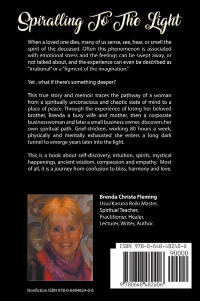 When a loved one dies, many of us sense, see, hear, or smell the spirit of the deceased. Often this phenomenon is associated with emotional stress and the feelings can be swept away, or not talked about, and the experience can even be described as "irrational" or a "figment of the imagination." Yet, what if there's something deeper? This true story and memoir traces the pathway of a woman from a spiritually unconscious and chaotic state of mind to a place of peace. Through the experience of losing her beloved brother, Brenda a busy wife and mother, than a corporate businesswoman and later a small business owner, discovers her own spiritual path. Grief-stricken, working 80 hours a week, physically and mentally exhausted she enters a long dark tunnel to emerge years later into the light. It is a book about self-discovery, intuition, spirits, mystical happenings, ancient wisdom, compassion and empathy. Most of all it is a journey from confusion to bliss, harmony and love.