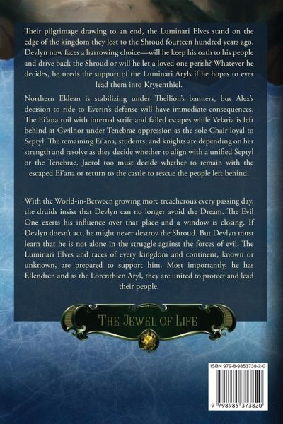 Their pilgrimage drawing to an end, the Luminari Elves stand on the edge of the kingdom they lost to the Shroud fourteen hundred years ago. Devlyn now faces a harrowing choice-will he keep his oath to his people and drive back the Shroud or will he let a loved one perish? Whatever he decides, he needs the support of the Luminari Aryls if he hopes to ever lead them into Krysenthiel. Northern Eklean is stabilizing under Thellion's banners, but Alex's decision to ride to Everin's defense will have immediate consequences. The Ei'ana roil with internal strife and failed escapes while Velaria is left behind at Gwilnor under Tenebrae oppression as the sole Chair loyal to Septyl. The remaining Ei'ana, students, and knights are depending on her strength and resolve as they decide whether to align with a unified Septyl or the Tenebrae. Jaerol too must decide whether to remain with the escaped Ei'ana or return to the castle to rescue the people left behind. With the World-in-Between growing more treacherous every passing day, the druids insist that Devlyn can no longer avoid the Dream. The Evil One exerts his influence over that place and a window is closing. If Devlyn doesn't act, he might never destroy the Shroud. But Devlyn must learn that he is not alone in the struggle against the forces of evil. The Luminari Elves and races of every kingdom and continent, known or unknown, are prepared to support him. Most importantly, he has Ellendren and as the Lorenthien Aryl, they are united to protect and lead their people.