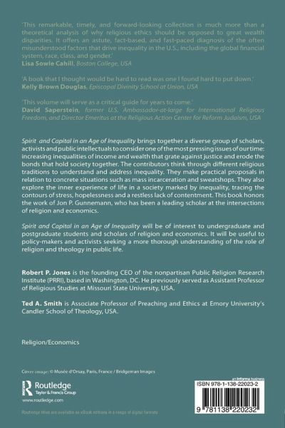 Contributors. Introduction. Robert P. Jones and Ted A. Smith. Thinking with Traditions. Chapter 1: The Little Commonwealth: The Family as Matrix of Markets and Morality in Early Protestantism. John Witte, Jr. and Justin J. Latterell. Chapter 2: When Ancient Teachings Meet Modern Problems: Jewish Approaches to Poverty, Inequality, and the Market. William A. Galston. Chapter 3: Election, Selection, and Distinction: Paradoxes of Grace, Clan, and Class. Timothy P. Jackson. Chapter 4: Pope Francis, Catholic Social Thought, and the Rejection of Fear. E.J. Dionne, Jr. Moral Sentiments. Chapter 5: More Than Enough: Contentment and the Dominance of the Economic Sphere. Christine D. Pohl. Chapter 6: Stress. Julie Meadows. Chapter 7: Riots and Rip-Offs in Baltimore: Toward a Theology of Hopelessness. Miguel A. De La Torre. For the Love of the World. Chapter 8: Wasting Human Lives: Hyper-Incarceration in the United States. Elizabeth M. Bounds. Chapter 9: Challenging a New Frontier of Market Morality: The Case of Sweatshop Economics. Keri Day. Chapter 10: Wage Against the Machine: Wage Activism, Worker Justice, and Disruptive Jesus in the Age of Advanced Capitalism. C. Melissa Snarr. Chapter 11: Speak Up, Judge Righteously, Stand with the Poor: The Jewish Imperative for Social Justice. Jonah Dov Pesner. Public Theology and the Common Good. Chapter 12: America, Land of the Free and Home of the Poor: Inequality as a Way of Life. Darryl M. Trimiew. Chapter 13: The Integrity of the Church in a Divided Society. Steven M. Tipton. Index.