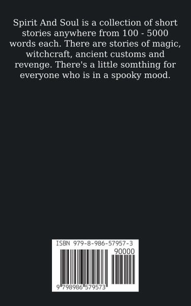 Spirit And Soul is a collection of short stories anywhere from 100 - 5000 words each. There are stories of magic, witchcraft, ancient customs and revenge. There's a little somthing for everyone who is in a spooky mood.