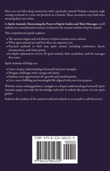 Have you ever felt a deep connection with a particular animal? Perhaps a majestic eagle soaring overhead or a wise owl perched on a branch. These encounters may hold more meaning than you realize. In Spirit Animals: Harnessing the Power of Spirit Guides and Their Messages, you'll embark on a transformative journey to discover the ancient wisdom of spirit animals. This comprehensive guide explores:The ancient origins and rich history of spirit animals across cultures. What spirit animals are and how they can empower you. Practical methods to find your spirit animal, including meditation, dream interpretation, and vision quests. In-depth explanations of over 20 spirit animals, their symbolism, and the messages they carry. Spirit Animals will help you:Gain a deeper understanding of yourself and your strengths. Navigate challenges with courage and clarity. Embrace new opportunities for growth and transformation. Live a more fulfilling and meaningful life aligned with your true purpose. Whether you're seeking guidance, strength, or a deeper understanding of yourself, Spirit Animals equips you with the knowledge and tools to unlock the power of your spirit guides. Embrace the wisdom of the natural world and embark on your path to self-discovery!