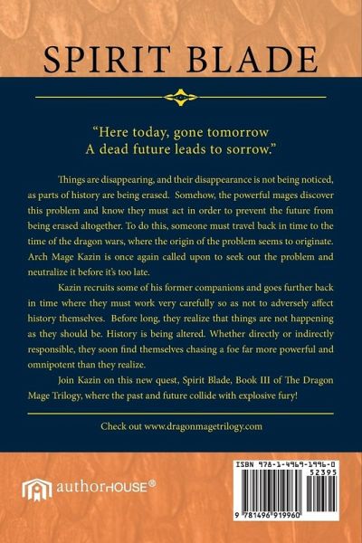 "Here today, gone tomorrow A dead future leads to sorrow." Things are disappearing, and their disappearance is not being noticed, as parts of history are being erased. Somehow, the powerful mages discover this problem and know they must act in order to prevent the future from being erased altogether. To do this, someone must travel back in time to the time of the dragon wars, where the origin of the problem seems to originate. Arch Mage Kazin is once again called upon to seek out the problem and neutralize it before it's too late. Kazin recruits some of his former companions and goes further back in time where they must work very carefully so as not to adversely affect history themselves. Before long, they realize that things are not happening as they should be. History is being altered. Whether directly or indirectly responsible, they soon find themselves chasing a foe far more powerful and omnipotent than they realize. Join Kazin on this new quest, Spirit Blade, Book III of The Dragon Mage Trilogy, where the past and future collide with explosive fury! Check out www.dragonmagetrilogy.com
