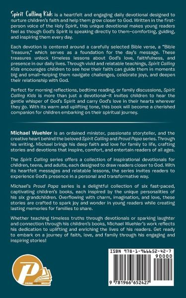 Spirit Calling Kids is a heartfelt and engaging daily devotional designed to nurture children's faith and help them grow closer to God. Written in the first-person voice of the Holy Spirit, this unique devotional makes young readers feel as though God's Spirit is speaking directly to them-comforting, guiding, and inspiring them every day. Each devotion is centered around a carefully selected Bible verse, a "Bible Treasure," which serves as a foundation for the day's message. These treasures unlock timeless lessons about God's love, faithfulness, and presence in our daily lives. Through vivid and relatable teachings, Spirit Calling Kids encourages children to see how their faith can guide them in moments big and small-helping them navigate challenges, celebrate joys, and deepen their relationship with God. Perfect for morning reflections, bedtime reading, or family discussions, Spirit Calling Kids is more than just a devotional-it invites children to hear the gentle whisper of God's Spirit and carry God's love in their hearts wherever they go. With its warm and uplifting tone, this book will become a cherished companion for children embarking on their spiritual journey.