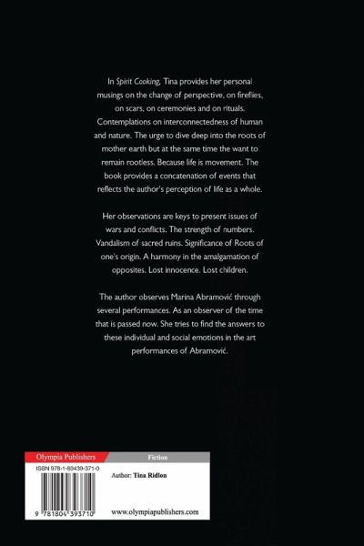 In Spirit Cooking, Tina provides her personal musings on the change of perspective, on fireflies, on scars, on ceremonies and on rituals. Contemplations on interconnectedness of human and nature. The urge to dive deep into the roots of mother earth but at the same time the want to remain rootless. Because life is movement. The book provides a concatenation of events that reflects the author's perception of life as a whole. Her observations are keys to present issues of wars and conflicts. The strength of numbers. Vandalism of sacred ruins. Significance of Roots of one's origin. A harmony in the amalgamation of opposites. Lost innocence. Lost children. The author observes Marina Abramovi¿ through several performances. As an observer of the time that is passed now. She tries to find the answers to these individual and social emotions in the art performances of Abramovi¿.