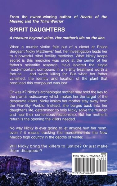 A Daphne Du Maurier 2023 WINNER in Mystery & Suspense! Her mother's unexpected return is the opening the killers need. When Police Sergeant Nicky Matthews investigates a ruthless murder, she discovers the victim is connected to a powerful tribal fertility medicine linked to her father's mysterious disappearance and death. But when her father died, the identity and location of the plant that produced the pivotal compound was lost. Or was it? Determined killers are now searching for her mother, who holds the key to the rare plant and untold riches to whoever rediscovers it. Nicky is determined to protect her mother at all costs-then, the unthinkable happens. In a desperate race, Nicky and her friends track the murderers into the New Mexico high country in the depths of winter, where the suspense builds to a heart-stopping climax. With danger and action at every turn, Spirit Daughters is a thrilling tale of murder, redemption, and family.