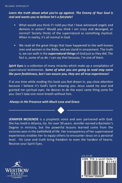 Learn the truth about what you're up against. The Enemy of Your Soul is real and wants you to believe he's a fairytale! ¿ What would you think if I told you that I have witnessed angels and demons in action? Would you think I am crazy and deranged, or normal? Society thinks of the supernatural as something mystical. When in reality, it's all normal in God. ¿ We read all the great things that have happened to the well-known men and women in the Bible, and we stand in amazement. The truth is, we can walk in the supernatural things of God just as they did. The fact is, some of us do. I can say that because, I'm one of them. Spirit Eyes is a collection of many miracles which make up a compilation of supernatural testimonies. Some of what you are going to read may seem like pure foolishness, but I can assure you, they are all true experiences! If at any time while reading this book you feel drawn in, pay close attention because I believe it's God's Spirit drawing you. Jesus saved my soul and granted me spiritual eyes. He desires to do the exact same thing same for you. Don't take one more breath without him. Always in His Presence with Much Love and Grace