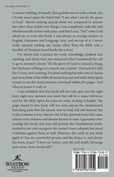 I contain nothing, of myself, that qualifies me to write a book, but I firmly stand upon the belief that "I am what I am by the grace of God." There's nothing special about me compared to anyone else other than maybe two things; I am completely, radically and wholeheartedly in love with Jesus, and that I said, "Yes!" when God asked me to write this book. I was always an average student in English, Literature and Language Arts, and on top of it, I never really enjoyed reading any books other than the Bible and a handful of Christian based books for school. I've always had a passion for truth, knowledge, wisdom and teaching, and those were just enhanced when I answered the call to go to ministry school. "It's the glory of God to conceal a thing, but the honor of kings is to search out a matter." And search I did! For 5 years, and counting, I've done nothing but take tons of classes and sit in front of the Bible for hours beyond end while Holy Spirit reveals to me the many answers contained within His pages. And what an honor it truly is! I am confident that this book will not only give you the right here, right now answers you need, but will be a major reference tool for the Holy Spirit for years to come, so keep it handy! The pages found in this book will not only expose the fundamental launching pads that the enemy uses to steal, kill and destroy, but it also contains a very cohesive list of the spiritual roots that cause almost every sickness and disease known to man. I guarantee after reading this book, that you will possess the foundational truths needed to not only recognize the enemy's basic schemes but stand victorious against them as well. However, the catch is, you must apply it! You are a powerful person, and the choice is, and always has been, yours! "I have set before your life and death, blessings and curses. Now choose life!"