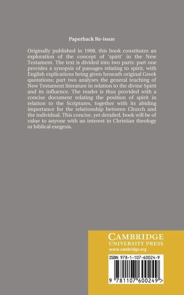 Originally published in 1908, this book constitutes an exploration of the concept of 'spirit' in the New Testament. The text is divided into two parts: part one provides a synopsis of passages relating to spirit, with English explications being given beneath original Greek quotations; part two analyses the general teaching of New Testament literature in relation to the divine Spirit and its influence. The reader is thus provided with a concise document relating the position of spirit in relation to the Scriptures, together with its abiding importance for the relationship between Church and the individual. This concise, yet detailed, book will be of value to anyone with an interest in Christian theology or biblical exegesis.