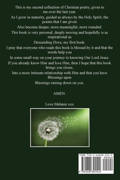 Melanie Woolner is a born again Christian, new author and ministry team member of church of the Nazarene, Morley, Leeds, England. She is married with two grown up daughters. Melanie is involved in teaching, preaching, praying, healing and deliverance ministries. This is the first book to be published and God willing it will not be the last! Melanie has been inundated with poetry from the Holy Spirit, often in the early hours of the morning and frequently woken from sleep to write down what is given from heaven. This book was God given to me to share with you, to inspire you, to help you, to give you words of encouragement, healing and teaching. May God bless you all who read these words.