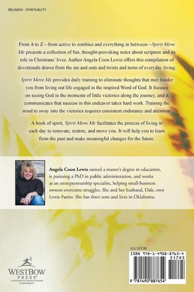 From A to Z—from active to zombies and everything in between—Spirit Move Me presents a collection of fun, thought-provoking notes about scripture and its role in Christians’ lives. Author Angela Coon Lewis offers this compilation of devotionals drawn from the ins and outs and twists and turns of everyday living. Spirit Move Me provides daily training to eliminate thoughts that may hinder you from living out life engaged in the inspired Word of God. It focuses on seeing God in the moments of little victories along the journey, and it communicates that success in this endeavor takes hard work. Training the mind to sway into the victories requires consistent endurance and attention. A book of spirit, Spirit Move Me facilitates the process of living in each day to renovate, restore, and move you. It will help you to learn from the past and make meaningful changes for the future.