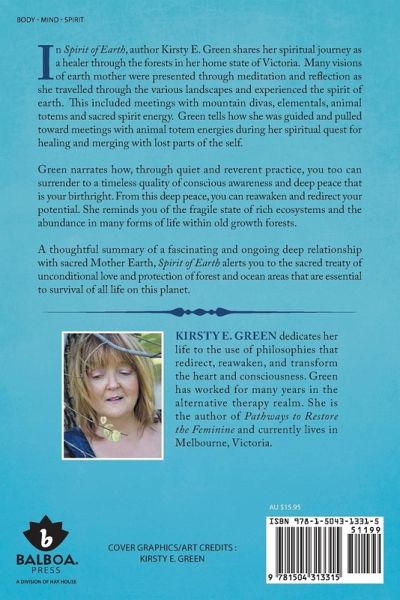 In Spirit of Earth, author Kirsty E. Green shares her spiritual journey as a healer through the forests in her home state of Victoria. Many visions of earth mother were presented through meditation and reflection as she travelled through the various landscapes and experienced the spirit of earth. This included meetings with mountain divas, elementals, animal totems and sacred spirit energy. Green tells how she was guided and pulled toward meetings with animal totem energies during her spiritual quest for healing and merging with lost parts of the self. Green narrates how, through quiet and reverent practice, you, too, can surrender to a timeless quality of conscious awareness and deep peace that is your birthright. From this deep peace, you can reawaken and redirect your potential. She reminds you of the fragile state of rich ecosystems and the abundance in many forms of life within old growth forests. A thoughtful summary of a fascinating and ongoing deep relationship with sacred Mother Earth, Spirit of Earth alerts you to the sacred treaty of unconditional love and protection of forest and ocean areas that are essential to survival of all life on this planet.