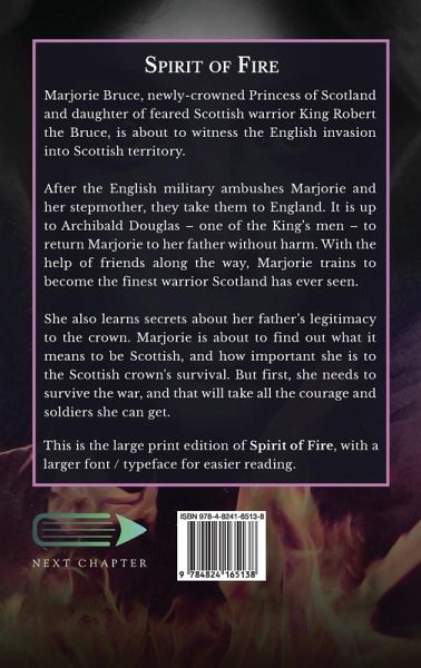 Marjorie Bruce, newly-crowned Princess of Scotland and daughter of feared Scottish warrior King Robert the Bruce, is about to witness the English invasion into Scottish territory. After the English military ambushes Marjorie and her stepmother, they take them to England. It is up to Archibald Douglas - one of the King's men - to return Marjorie to her father without harm. With the help of friends along the way, Marjorie trains to become the finest warrior Scotland has ever seen. She also learns secrets about her father's legitimacy to the crown. Marjorie is about to find out what it means to be Scottish, and how important she is to the Scottish crown's survival. But first, she needs to survive the war, and that will take all the courage and soldiers she can get. This is the large print edition of Spirit of Fire, with a larger font / typeface for easier reading.