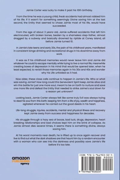 Jamie Carter was lucky to make it past his 10th birthday. From the time he was a young child, freak accidents had almost robbed him of his life. If it wasn't for something seemingly Divine saving him at the last second, the Entity that seemed to chase Jamie most of his life, would have succeeded. From the age of about 3 years-old, Jamie suffered accidents that left him electrocuted, with broken bones, beaten by a shameless step-father, almost dragged by a subway and basically drowned by riptide at Coney Island, all before Jamie turned 10. In Jamie's late teens and early 20s, the pain of his childhood years, manifested in consistent binge drinking and recreational drugs in his downtime away from work. It was as if his childhood memories would never leave him and Jamie did whatever he could to escape mentally while trying to live a normal life, meanwhile creating boxes of depression in his mind that would be opened later, when he least expected, to revisit those memories again in his 30s and 40s and wonder why his unfolded as it had. Now older, these close calls continue to happen in Jamie's life. Who or what was saving Jamie? How long could this benevolent Spirit keep Jamie alive and win this battle for just one more soul, meant to be on Earth to nurture and save one more life and defeat the Entity that needed to strike Jaime's soul down for a reason yet unknown? Looking back, Jamie Carter always felt like some truly Evil was always trying to steal his soul from this Earth; keeping him from a life of joy, wealth and happiness, agitated whenever he carried out the good deeds in his heart. Life-long struggle, injuries, accidents, mental and physical illness and recovery kept Jamie away from success and happiness for decades. His struggle through a hazy sea of booze, bad luck, drugs, depression, heart breaking relationships and bad choices kept him on the brink of collapse. As Jamie almost dies several times, it seems there is something divine, always saving him. At his worst moments near death, he is lifted up to once again recover and live to find out what the dark shadows are that haunt him by a random encounter with a woman who can see into the darkness and possibly save Jamie's life before it's too late.