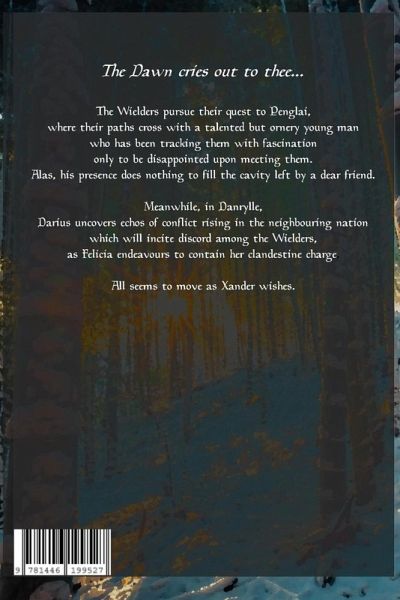 The Wielders pursue their quest to Penglai, where their paths cross with a talented but ornery young man who has been tracking them with fascination only to be disappointed upon meeting them. Alas, his presence does nothing to fill the cavity left by a dear friend. Meanwhile, in Danrylle, Darius uncovers echoes of conflict rising in the neighbouring nation which will incite discord among the Wielders, as Felicia endeavours to contain her clandestine charge. All seems to move as Xander wishes.