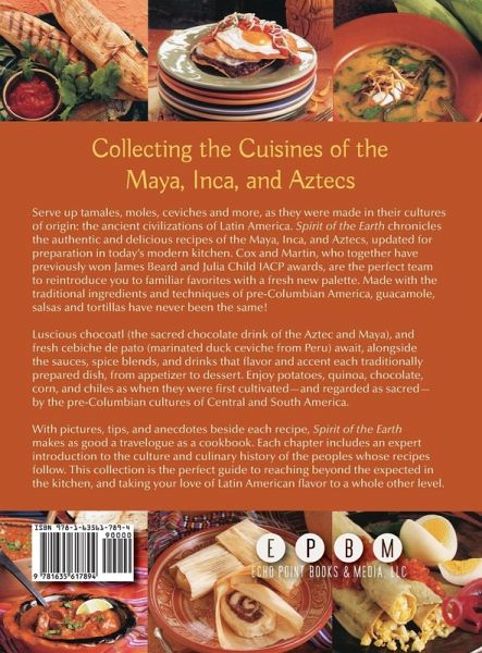 Serve up tamales, moles, ceviches and more, as they were made in their cultures of origin: the ancient civilizations of Latin America. Spirit of the Earth chronicles the authentic and delicious recipes of the Maya, Inca, and Aztecs, updated for preparation in your modern kitchen. With previous collaborations winning James Beard and Julia Child IACP awards, Cox and Martin are the perfect team to reintroduce you to familiar favorites with a fresh new palette. Made with the traditional ingredients and techniques of pre-Columbian America, guacamole, salsas and tortillas have never been the same! Luscious chocoatl (the sacred chocolate drink of the Aztec and Maya), and fresh cebiche de pato (marinated duck ceviche from Peru) await, alongside the sauces, spice blends, and drinks that flavor and accent each traditionally prepared dish, from appetizer to dessert. Enjoy potatoes, quinoa, chocolate, corn, and chiles as when they were first cultivated - and regarded as sacred - by the pre-Columbian cultures of Central and South America With pictures, tips, and anecdotes beside each recipe, Spirit of the Earth makes as good a travelogue as a cookbook. Each chapter includes an expert introduction to the culture and culinary history of the peoples whose recipes follow. This collection is the perfect guide to reaching beyond the expected in the kitchen, and taking your love of Latin American flavor to a whole other level. This book is also available from Echo Point Books as a paperback (ISBN 1635616883). Be sure to also pick up the other luscious book of regional fare by this incomparable duo, Spirit of the West!