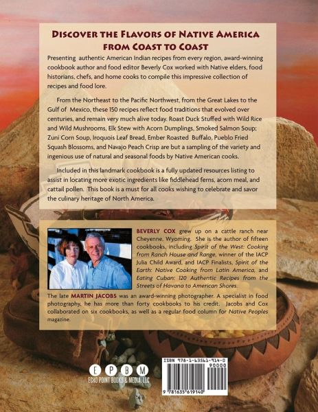 Discover the Flavors of Native America from Coast to Coast Presenting authentic American Indian recipes from every region, award winning cookbook author and food editor Beverly Cox worked with Native elders, food historians, chefs and home cooks to compile this impressive collection of recipes and food lore. From the Northeast to the Pacific Northwest, from the Great Lakes to the Gulf of Mexico, these 150 recipes reflect food traditions that evolved over centuries, and remain very much alive today. Roast Duck Stuffed with Wild Rice and Wild Mushrooms; Elk Stew with Acorn Dumplings; Smoked Salmon Soup; Zuni Corn Soup; Iroquois Leaf Bread; Ember Roasted Buffalo; Pueblo Fried Squash Blossoms; and Navajo Peach Crisp are but a sampling of the variety and ingenious use of natural and seasonal foods by Native American cooks. Included in Spirit of the Harvest is a fully updated resources listing to assist in locating more exotic ingredients like fiddlehead ferns, acorn meal, and cattail pollen. This book is a must for all cooks wishing to celebrate and savor the culinary heritage of North America. This book is also available from Echo Point Books in hardcover, ISBN 1635619157. Lovers of Beverly Cox's incomparable cuisine will also want to have her other cookbooks in the Spirit series: Spirit of the West (hardcover ISBN 1635617634) and Spirit of the Earth (hardcover ISBN 1635617898, paperback ISBN 1635616883). 256 pages, with 57 color photographs.