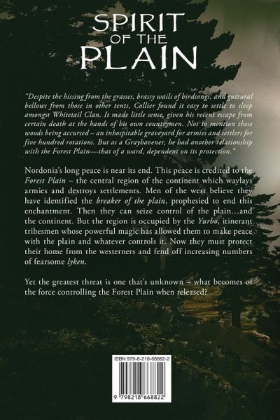 In Grayhaven, they say, "Glory to Ahur and to the Plain." They speak of the Forest Plain, the heart of the continent that, for five centuries, has prevented men from setting, farming, or travelling across with armies. It is the Plain they credit for their growth into the wealthiest nation on the continent. In Spirt of the Plain, book one of The Unnamed trilogy, we meet COLLIER TRUITT, of Grayhaven. He is of aristocratic birth but flees after his grandfather's failed political machinations lead to the murder of their family. He is part Yurbo, through his father and seeks out his father's clan, determined to win their help in retaking his ancestral titles. This is not something the Yurbo due to the complicated peace they've made with the Plain and the spirit that controls it, which they call Allouhuille. He resolves that his only option is to stay till such a time he can return with some modicum or aid or a plan. While in the plain, Collier faces mounting threats with his Yurbo hosts. One threat is the fearsome wolfmen known as Lyken, themselves refugees from colonized homeland. This includes the drunk and shaggy ARNAK, and his friend, the troubadour MOJAG. They flee for Grayhaven but run into the Yurbo. The greater threat is from the west. There, ASHLYN, an acolyte of the order of mages known as the Bruj, heads into the Forest Plain to complete her prophesized destiny to break the Plain's curse.
