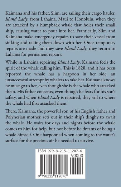 Sailing from Lahaina, Maui to their homeport of Honolulu aboard their cargo-hauling schooner, Island Lady, Kaimana, and his father, Slim, are attacked by a large humpback whale. She puts a hole in the bow of their small ship, breaking several of the planks and damaging some of the ribs, causing water to pour into her. Frantically, Slim and Kaimana make emergency repairs to save their vessel from sinking and taking them down with her. Once temporary repairs are made and they save their ship, they return to Lahaina for permanent repairs. While in Lahaina repairing Island Lady, Kaimana feels the spirit of the whale calling him. This is 1856, and it has been reported the whale has a harpoon in her side, the unsuccessful attempt by whalers to take her. Kaimana knows he must go to her. After repairs to Island Lady are made, father and son sail to where the whale had previously attacked them. There, Kaimana, the powerful son of his English father and Polynesian mother, sets out in their ship's dinghy to await the whale. Eventually, the whale warily approaches Kaimana, her calf by her side, but not before he dreams of being a whale himself, one harpooned when coming to the water's surface for the precious air he needs to survive.