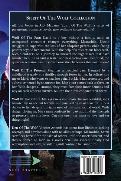 All four books in A.D. McLain's 'Spirit Of The Wolf', a series of paranormal romance novels, now available in one volume! Wolf Of The Past: David is a boy without a family, until an unexpected encounter changes everything. Meanwhile, Nicole struggles to cope with the loss of her adoptive parents while facing powers beyond her control. With the help of a mysterious black wolf, Nicole embarks on a journey to unravel the nightmares that have haunted her. But as trust is tested and new feelings are unearthed, the question remains: can they overcome the challenges that await them? Wolf Of The Present: Meg has a troubled past. Haunted by a childhood tragedy, she shuffles through foster homes. In college, she meets Mark, who wants to heal her pain. But Mark has secrets too, and as he's tormented by an unseen foe, Meg's past comes back to threaten her. With danger all around, they must face their inner demons and rely on each other to survive. But can their love conquer their fears? Wolf Of The Future: Mara is a werewolf. Powerful and beautiful, she's haunted by an ancient betrayal and pursued by an old enemy. Billy is drawn to her despite his ignorance of the paranormal world. With danger closing in, Mara must confront her past and find the strength to protect those she loves. Can she open her heart to love and set things right? Den Of The Wolf: Vincent Artemis has spent four lifetimes seeking revenge, and now he's alone with no allies or hope. Meanwhile, Seren sacrifices herself for the sake of others, until she meets Vincent, and they're forced to hide in a wolf's den. Can Vincent finally find redemption and love, or will his guilt continue to haunt him?