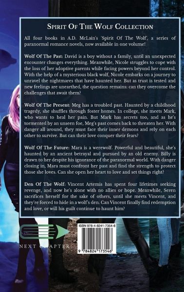 All four books in A.D. McLain's 'Spirit Of The Wolf', a series of paranormal romance novels, now available in one volume! Wolf Of The Past: David is a boy without a family, until an unexpected encounter changes everything. Meanwhile, Nicole struggles to cope with the loss of her adoptive parents while facing powers beyond her control. With the help of a mysterious black wolf, Nicole embarks on a journey to unravel the nightmares that have haunted her. But as trust is tested and new feelings are unearthed, the question remains: can they overcome the challenges that await them? Wolf Of The Present: Meg has a troubled past. Haunted by a childhood tragedy, she shuffles through foster homes. In college, she meets Mark, who wants to heal her pain. But Mark has secrets too, and as he's tormented by an unseen foe, Meg's past comes back to threaten her. With danger all around, they must face their inner demons and rely on each other to survive. But can their love conquer their fears? Wolf Of The Future: Mara is a werewolf. Powerful and beautiful, she's haunted by an ancient betrayal and pursued by an old enemy. Billy is drawn to her despite his ignorance of the paranormal world. With danger closing in, Mara must confront her past and find the strength to protect those she loves. Can she open her heart to love and set things right? Den Of The Wolf: Vincent Artemis has spent four lifetimes seeking revenge, and now he's alone with no allies or hope. Meanwhile, Seren sacrifices herself for the sake of others, until she meets Vincent, and they're forced to hide in a wolf's den. Can Vincent finally find redemption and love, or will his guilt continue to haunt him?