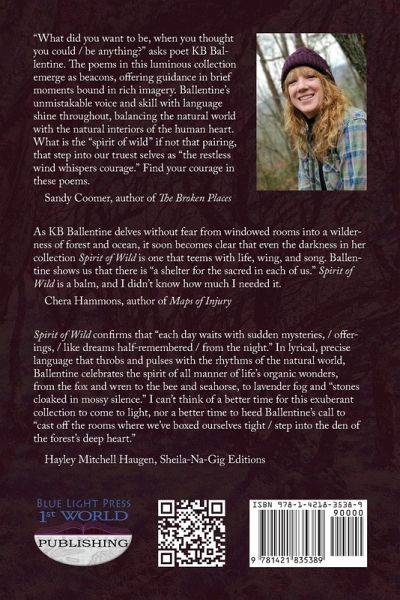 Wild weaves through each of us, but the spirit of wild doesn't always rage. Sometimes it is the gentle, quiet moments alone in our souls that show us who and what we are. The spirit of strength, the spirit of wonder, the spirit of curiosity, the spirit of fury, the spirit of peace are all part of us. But we bottle or ignore them, questioning our anxiety and depression. These poems speak to that spark in each of us that we might remember even through our sorrows, tragedies, joys, and silent seasons that the spirit of wild doesn't call us - it is us. Don't ignore it. Don't let it go. Hold it tight as you dream, when you wake, and as you live your day. Yes, live. Live and embrace wild. "What did you want to be, when you thought you could / be anything?" asks poet KB Ballentine. The poems in this luminous collection emerge as beacons, offering guidance in brief moments bound in rich imagery. Ballentine's unmistakable voice and skill with language shine throughout, balancing the natural world with the natural interiors of the human heart. What is the "spirit of wild" if not that pairing, that step into our truest selves as "the restless wind whispers courage." Find your courage in these poems. -Sandy Coomer, author of The Broken Places As KB Ballentine delves without fear from windowed rooms into a wilderness of forest and ocean, it soon becomes clear that even the darkness in her collection Spirit of Wild is one that teems with life, wing, and song. Ballentine shows us that there is "a shelter for the sacred in each of us." Spirit of Wild is a balm, and I didn't know how much I needed it. -Chera Hammons, author of Maps of Injury Spirit of Wild confirms that "each day waits with sudden mysteries, / offerings, / like dreams half-remembered / from the night." In lyrical, precise language that throbs and pulses with the rhythms of the natural world, Ballentine celebrates the spirit of all manner of life's organic wonders, from the fox and wren to the bee and seahorse, to lavender fog and "stones cloaked in mossy silence." I can't think of a better time for this exuberant collection to come to light, nor a better time to heed Ballentine's call to "cast off the rooms where we've boxed ourselves tight / step into the den of the forest's deep heart." -- Hayley Mitchell Haugen, Sheila-Na-Gig Editions