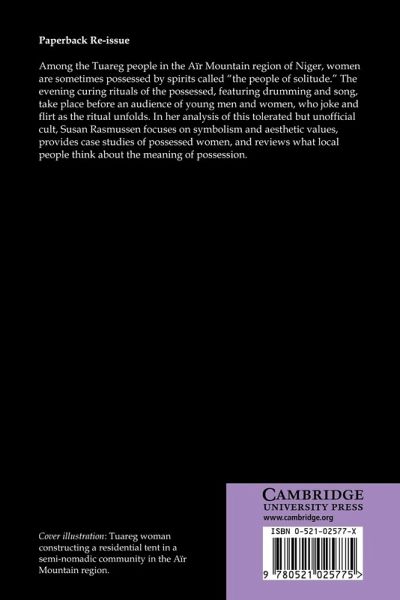 Among the Tuareg people in the Air Mountain region of Niger, women are sometimes possessed by spirits called "the people of solitude". The evening curing rituals of the possessed, featuring drumming and song, take place before an audience of young men and women, who joke and flirt as the ritual unfolds. In her analysis of this tolerated but unofficial cult, Susan Rasmussen analyses symbolism and aesthetic values, provides case studies of possessed women, and reviews what local people think about the meaning of possession.