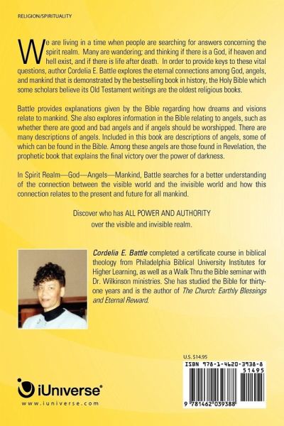 We are living in a time when people are searching for answers concerning the spirit realm. Many are wandering; and thinking if there is a God, if heaven and hell exist, and if there is life after death. In order to provide keys to these vital questions, author Cordelia E. Battle explores the eternal connections among God, angels, and mankind that is demonstrated by the bestselling book in history, the Holy Bible which some scholars believe its Old Testament writings are the oldest religious books. Battle provides explanations given by the Bible regarding how dreams and visions relate to mankind. She also explores information in the Bible relating to angels, such as whether there are good and bad angels and if angels should be worshipped. There are many descriptions of angels. Included in this book are descriptions of angels, some of which can be found in the Bible. Among these angels are those found in Revelation, the prophetic book that explains the final victory over the power of darkness. In Spirit Realm¿God¿Angels¿Mankind, Battle searches for a better understanding of the connection between the visible world and the invisible world and how this connection relates to the present and future for all mankind. Discover who has ALL POWER AND AUTHORITY over the visible and invisible realm.