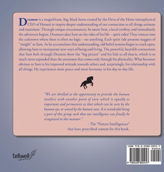 Dramon is a magnificent, big, black horse created by the Deva of the Horse (metaphysical CEO of Horses) to inspire deeper understanding of our connection to all things animate and inanimate. Through unique circumstances, he meets Sam, a local cowboy, and immediately the adventure begins. Dramon takes Sam on rides of his life - spirit rides! They adventure into the unknown where there is often no logic - no anything. Each spirit ride presents nuggets of "insight" to Sam. As he accumulates this understanding, old belief systems begin to crack open, allowing Sam to incorporate new ways of being and living. The powerful, heartfelt connections that Sam feels through Dramon show the "big picture" and his link to all-that-is, which is so much more expanded than the awareness that comes only through his physicality. What becomes obvious to Sam is his improved attitude towards others and, surprisingly, his relationship with all things. He experiences more peace and harmony in his day-to-day life.