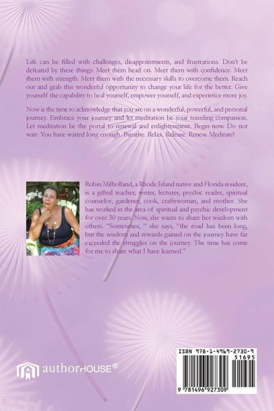 Life can be filled with challenges, disappointments, and frustrations. Don't be defeated by these things. Meet them head on. Meet them with confidence. Meet them with strength. Meet them with the necessary skills to overcome them. Reach out and grab this wonderful opportunity to change your life for the better. Give yourself the capability to heal yourself, empower yourself, and experience more joy. Now is the time to acknowledge that you are on a wonderful, powerful, and personal journey. Embrace your journey and let meditation be your traveling companion. Let meditation be the portal to renewal and enlightenment. Begin now. Do not wait. You have waited long enough. Breathe. Relax. Release. Renew. Meditate!