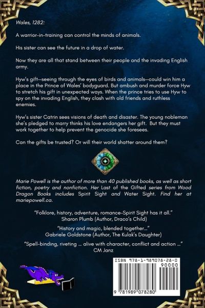 "Intoxicating, electrifying... fantastic yet realistic and relatable realms... Highly recommended!" - thereadera Two siblings pledge their magical gifts to protect their people from the invading English, with the help of the last true Prince of Wales-after his murder. Warrior-in-training Hyw can control the minds of animals. His sister Catrin can see the future in a drop of water. Hyw wants to use his gift to win a place in the Prince of Wales' bodyguard. Then ambush and murder stretch the gift in unexpected ways, as the slain prince's spirit melds with Hyw to help him fight back against the ruthless army of Edward I. Catrin's visions hold only disaster and death. She must convince the young nobleman she's pledged to marry to help prevent the genocide she foresees. Can the gifts be trusted? Or will their world shatter around them? This award-winning medieval fantasy combines magic, mythology, and historical legends with the realities of 13th Century Wales. Winner of the Moonbeam Bronze Medal for YA Fiction "Filled with adventure and romance and a touch of fantasy... Highly Recommended." 5 Stars - CM Reviews "Dramatic descriptions and gripping scenes will make you hold your breath as the straight-forward narrative style of the author will keep your eyes peeled... If you love historic tales, look no further than this jewel crafted by Marie Powell..." Scribble's Worth "Powell does a great job mixing elements of fantasy, mythology, and historical conflict... Overall, a meticulously researched young adult medieval fantasy with compelling characters and high-stakes action. Recommended." Historical Novels Review "Weaving history with romance and fantasy-elegant yet immediately accessible. Highly Recommended." Top Shelf Magazine "Well researched and beautifully written, Powell keeps us riveted... History and magic are intertwined effortlessly to cast a spell over the reader..." Ottawa Review of Books