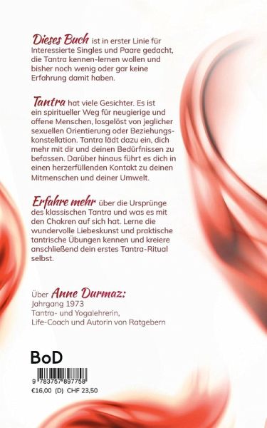 Spirit Tantra - Der Ratgeber für EinsteigerDieses Buch ist in erster Linie für Interessierte Singles und Paare gedacht, die Tantra kennenlernen wollen und bisher noch wenig oder gar keine Erfahrung damit haben.Tantra hat viele Gesichter. Es ist ein spiritueller Weg für neugierige und offene Menschen,losgelöst von jeglicher sexuellen Orientierung oder Beziehungskonstellation. Tantra lädtdazu ein, dich mehr mit dir und deinen Bedürfnissen zu befassen. Darüber hinaus führt esdich in einen herzerfüllenden Kontakt zu deinen Mitmenschen und deiner Umwelt.Erfahre mehr über die Ursprünge des klassischen Tantra und was es mit den Chakren aufsich hat. Lerne die wundervolle Liebeskunst und praktische tantrische Übungen kennenund kreiere anschließend dein erstes Tantra-Ritual selbst.Über Anne Durmaz:Jahrgang 1973. Tantra- und Yogalehrerin, Life-Coach und Autorin von Ratgebern