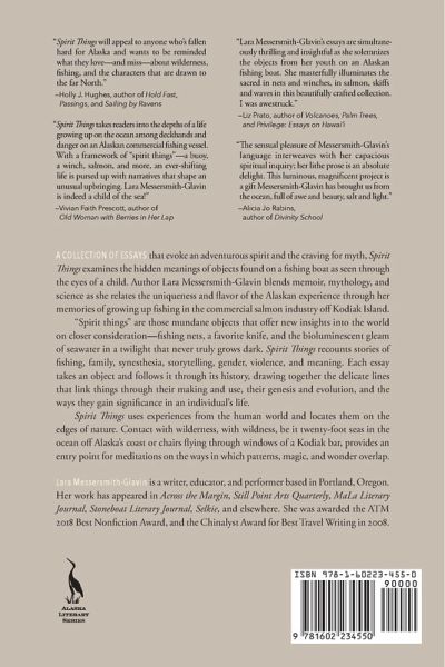 A collection of essays that evoke an adventurous spirit and the craving for myth, Spirit Things examines the hidden meanings of objects found on a fishing boat, as seen through the eyes of a child. Author Lara Messersmith-Glavin blends memoir, mythology, and science as she relates the uniqueness and flavor of the Alaskan experience through her memories of growing up fishing in the commercial salmon industry off Kodiak Island. "Spirit things" are those mundane objects that offer new insights into the world on closer consideration-fishing nets, a favorite knife, and the bioluminescent gleam of seawater in a twilight that never truly grows dark. Spirit Things recounts stories of fishing, family, synesthesia, storytelling, gender, violence, and meaning. Each essay takes an object and follows it through histories: personal, material, and scientific, drawing together the delicate lines that link things through their making and use, their genesis and evolution, and the ways they gain significance in an individual's life. A contemplative take on everything from childcare to neurodivergence, comfort foods to outlaws, Spirit Things uses experiences from the human world and locates them on the edges of nature. Contact with wilderness, with wildness, be it twenty-foot seas in the ocean off Alaska's coast or chairs flying through windows of a Kodiak bar, provides an entry point for meditations on the ways in which patterns, magic, and wonder overlap.
