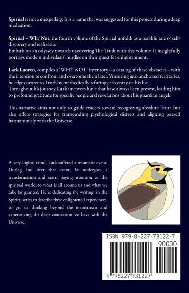 Spirital is not a misspelling. It is a name that was suggested for this project during a deep meditation. Spirital - Why Not, the fourth volume of the Spirital unfolds as a real-life tale of self-discovery and realization. Embark on an odyssey towards uncovering The Truth with this volume. It insightfully portrays modern individuals' hurdles on their quest for enlightenment. Lark Lauren, compiles a 'WHY NOT' inventory-a catalog of these obstacles-with the intention to confront and overcome them later. Venturing into uncharted territories, he edges nearer to Truth by methodically refuting each entry on his list. Throughout his journey, Lark uncovers hints that have always been present, leading him to profound gratitude for specific people and revelations about his guardian angels. This narrative aims not only to guide readers toward recognizing absolute Truth but also offers strategies for transcending psychological distress and aligning oneself harmoniously with the Universe.