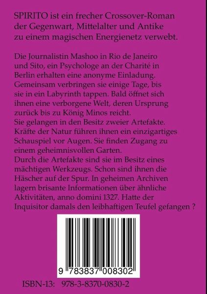 SPIRITO ist ein frecher Crossover-Roman, der Gegenwart, Mittelalter und Antike zu einem magischen Energienetz verwebt.Die Journalistin Mashoo in Rio de Janeiro und Sito, ein Psychologe an der Charité in Berlin erhalten eine anonyme Einladung.Gemeinsam verbringen sie einige Tage, bis sie in ein Labyrinth tappen. Bald öffnet sich ihnen eine verborgene Welt, deren Ursprung zurück bis zu König Minos reicht. Sie gelangen in den Besitz zweier Artefakte.Kräfte der Natur führen ihnen ein einzigartiges Schauspiel vor Augen und katapultieren sie zurück in die Freiheit. Sie finden Zugang zu einem geheimnisvollen Garten. Bald erkennen sie, dass sie durch die Artefakte im Besitz eines mächtigen Werkzeugs sind. Obwohl sie gut getarnt agieren, sind ihnen die Häscher bereits auf der Spur. In geheimen Archiven lagern brisante Informationen über ähnliche Aktivitäten, anno domini 1327. Hatte der Inquisitor damals den leibhaftigen Teufel gefangen?
