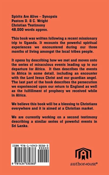 THIS BOOK REPRESENTS BOTH BELIEVERS AND NON-BELIEVERS OF SPIRITUAL WARFARE. FOR THOSE NON-BELIEVERS, WHEN YOU HAVE FINISHED READING THE CONTENTS OF THIS BOOK, YOU WILL BE ABLE TO LOOK BACK AT YOUR OWN LIFE AND SEE GOOD AND BAD THINGS WHICH HAVE HAPPENED IN THE COURSE OF LIFE. SOMETIMES WE TAKE THESE FOR GRANTED BUT FOR THOSE BELIEVERS, THIS IS AN INSPIRATION AND ENCOURAGEMENT TO TRUST MORE IN THE WAY GOD WORKS IN EVERYONE'S LIVES AND HOW THE UNSEEN SPIRITS CAN DESTROY LIFE AND WORK AGAINST EACH OTHER. 'SPIRITS ARE ALIVE' WAS WRITTEN FOLLOWING A MISSIONARY TRIP TO UGANDA AND RECOUNTS THE POWERFUL SPIRITUAL EXPERIENCES WE ENCOUNTERED DURING OUR THREE MONTHS OF LIVING AMONGST THE LOCAL TRIBES PEOPLE. IT OPENS BY DESCRIBING HOW WE MET, JUST 2 YEARS AFTER GIVING OUR LIVES TO THE LORD AND MOVES ON TO A SERIES OF MIRACULOUS EVENTS LEADING UP TO OUR DEPARTURE FOR AFRICA. IT THEN DESCRIBES THE EVENTS IN AFRICA IN SOME DETAIL, INCLUDING AN ENCOUNTER WITH THE LORD JESUS CHRIST AS WELL AS SPIRITS BOTH HEAVENLY AND DEMONIC. THE LAST PART OF THE BOOK DESCRIBES THE PERSECUTION WE EXPERIENCED UPON OUR RETURN TO ENGLAND AS WELL AS THE FULFILLMENT OF A PROPHECY WHICH WE RECEIVED WHILST IN AFRICA. WE BELIEVE THIS BOOK WILL BE A BLESSING TO ALL WHO READ IT. MANY PEOPLE DON'T BELIEVE IN RELIGION OR RELIGIOUS ORGANIZATIONS YET DEEP IN THEIR HEARTS THEY CAN RECOGNIZE BOTH GOOD AND EVIL AND THEREFORE THIS TESTIMONY WILL BE A BLESSING TO BOTH THE CHRISTIAN AND THE NON-CHRISTIAN MARKET. WE ARE CURRENTLY WORKING ON A SECOND TESTIMONY DESCRIBING A SIMILAR SERIES OF POWERFUL EVENTS BOTH AT HOME IN CORNWALL AND IN MANY PARTS OF THE WORLD.