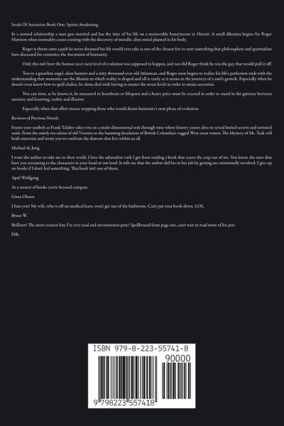 Seeds Of Ascension Book One: Spirits Awakening In a normal relationship a man gets married and has the time of his life on a memorable honeymoon in Hawaii. A small dilemma begins for Roger Harrison when normality ceases existing with the discovery of metallic alien metal planted in his body. Roger is thrust onto a path he never dreamed his life would ever take as one of the chosen few to start something that philosophers and spiritualists have discussed for centuries; the Ascension of humanity. Only this isn't how the human race's next level of evolution was supposed to happen, and nor did Roger think he was the guy that would pull it off. Toss in a guardian angel, alien hunters and a sixty-thousand-year-old Atlantean, and Roger soon begins to realize his life's perfection ends with the understanding that memories are the illusion to which reality is draped and all is rarely as it seems in the journeys of a soul's growth. Especially when he doesn't even know how to spell chakra, let alone deal with having to master the seven levels in order to attain ascension. Nor can time, as he knows it, be measured in heartbeats or lifespans and a heavy price must be exacted in order to stand in the gateway between memory and knowing, reality and illusion. Especially when that effort means stopping those who would doom humanity's next phase of evolution. Reviews of Previous Novels Fasten your seatbelt as Frank Talaber takes you on a multi-dimensional trek through time where history comes alive to reveal buried secrets and tortured souls. From the stately tea salons of old Victoria to the haunting desolation of British Columbia's rugged West coast waters, The Mystery of Ms. Teak will both entertain and invite you to confront the demons that live within us all. Michael de Jong I want the author to take me to their world. I love the adrenaline rush I get from reading a book that scares the crap out of me. You know, the ones that have you screaming to the characters in your head or out loud. It tells me that the author did his or her job by getting me emotionally involved. I give up on books if I don't feel something. This book isn't one of those. April Wolfgong As a weaver of books you're beyond compare. Greta Olsson I hate you! My wife, who is off on medical leave, won't get out of the bathroom. Can't put your book down. LOL. Bruce W. Brilliant! The most craziest lore I've ever read and awesomeness pure! Spellbound from page one, can't wait to read more of his pen. Pille