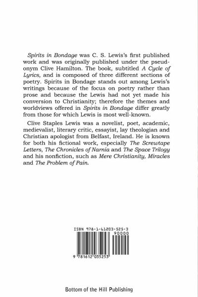 Spirits in Bondage was C. S. Lewis's first published work and was originally published under the pseudonym Clive Hamilton. The book, subtitled A Cycle of Lyrics, and is composed of three different sections of poetry. Spirits in Bondage stands out among Lewis's writings because of the focus on poetry rather than prose and because the Lewis had not yet made his conversion to Christianity; therefore the themes and worldviews offered in Spirits in Bondage differ greatly from those for which Lewis is most well-known. Clive Staples Lewis was a novelist, poet, academic, medievalist, literary critic, essayist, lay theologian and Christian apologist from Belfast, Ireland. He is known for both his fictional work, especially The Screwtape Letters, The Chronicles of Narnia and The Space Trilogy and his nonfiction, such as Mere Christianity, Miracles and The Problem of Pain.