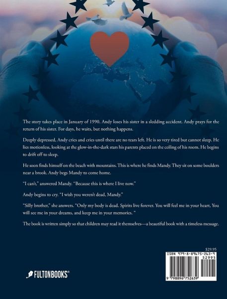 The story takes place in January of 1990. Andy loses his sister in a sledding accident. Andy prays for the return of his sister. For days, he waits, but nothing happens. Deeply depressed, Andy cries and cries until there are no tears left. He is so very tired but cannot sleep. He lies motionless, looking at the glow-in-the-dark stars his parents placed on the ceiling of his room. He begins to drift off to sleep. He soon finds himself on the beach with mountains. This is where he finds Mandy. They sit on some boulders near a brook. Andy begs Mandy to come home. "I can't," answered Mandy. "Because this is where I live now." Andy begins to cry. "I wish you weren't dead, Mandy." "Silly brother," she answers. "Only my body is dead. Spirits live forever. You will feel me in your heart, You will see me in your dreams, and keep me in your memories. " The book is written simply so that children may read it themselves--a beautiful book with a timeless message.