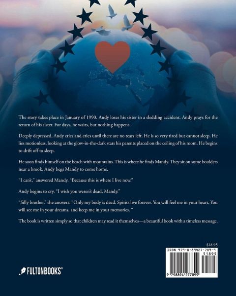 The story takes place in January of 1990. Andy loses his sister in a sledding accident. Andy prays for the return of his sister. For days, he waits, but nothing happens. Deeply depressed, Andy cries and cries until there are no tears left. He is so very tired but cannot sleep. He lies motionless, looking at the glow-in-the-dark stars his parents placed on the ceiling of his room. He begins to drift off to sleep. He soon finds himself on the beach with mountains. This is where he finds Mandy. They sit on some boulders near a brook. Andy begs Mandy to come home. "I can't," answered Mandy. "Because this is where I live now." Andy begins to cry. "I wish you weren't dead, Mandy." "Silly brother," she answers. "Only my body is dead. Spirits live forever. You will feel me in your heart, You will see me in your dreams, and keep me in your memories. " The book is written simply so that children may read it themselves--a beautiful book with a timeless message.