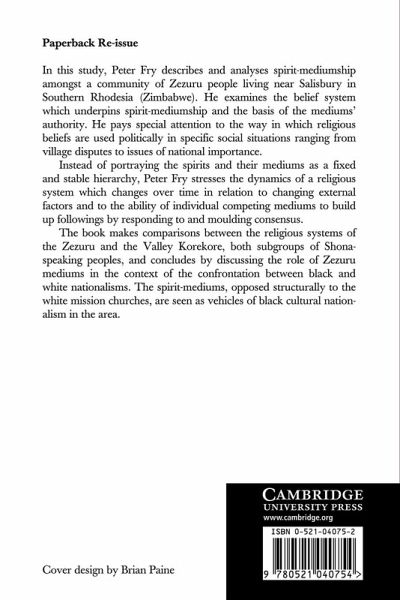 In this study, Peter Fry describes and analyses spirit-mediumship amongst a community of Zezuru people living near Salisbury in Southern Rhodesia (Zimbabwe).