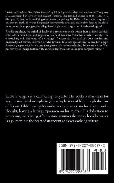 "Spirits of Zangbeto: The Hidden Horrors" by Eddie Inyangala delves into the heart of Zangbeto, a village steeped in mystery and ancient customs. The tranquil existence of the villagers is disrupted by a series of terrifying occurrences, propelling Dr. Rebecca Lawson on a quest to unearth the truth. However, her pursuit inadvertently awakens a malevolent force as the blood moon looms large, plunging the village into a nightmare straight out of whispered legends. Amidst the chaos, the arrival of Ezulwini, a mysterious witch doctor from a feared cannibal tribe, offers both hope and trepidation as he delves into forbidden rituals to combat the encroaching evil. The unity of the villagers fractures as they confront both familiar and unprecedented terrors, uncertain of who to trust. In a race against time to save her village, Rebecca grapples with her destiny, facing unearthly horrors unleashed by ancient curses. Will her bravery be enough to thwart the darkness that threatens to consume Zangbeto forever? This masterful tale by Eddie Inyangala weaves together cultural heritage and spine-tingling suspense. "Spirits of Zangbeto: The Hidden Horrors" promises to enthrall readers with its emotionally charged narrative, reminiscent of Inyangala's previous work, "Aminata's Journey: A Tale of Strength and Survival." The novel is enhanced with vivid illustrations that breathe life into the eerie and mystical atmosphere of Zangbeto, immersing readers in a world where secrets lurk in every shadow. Delve into the haunting pages of "Spirits of Zangbeto: The Hidden Horrors" to unravel the enigmatic secrets of Zangbeto.