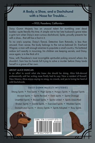A Body, a Shoe, and a Dachshund with a Nose for Trouble... -1925, Pasadena, California- Daisy Gumm Majesty has an unusual talent for stumbling over dead bodies-quite literally this time. A simple visit to her late husband's grave takes a grim turn when Daisy's ever-curious dachshund, Spike, proudly presents her with a shoe... that still has a foot in it. To no one's surprise, Daisy's fiancé, Detective Sam Rotondo, is less than amused. Even worse, the body belongs to the not-so-beloved Dr. Everhard Wagner, a man with enough enemies to populate a small country. His battered widow isn't exactly in mourning, his children are keeping secrets, and Daisy, once again, is in the thick of it. Now, with Pasadena's most incorrigible spiritualist poking around where she shouldn't, Sam has his hands full trying to solve a murder before Daisy lands herself in a grave of her own. Alice Duncan spent years avoiding what she knew she should be doing-writing-by professionally folk dancing instead. Eventually, her muse won the battle, and she's been crafting engaging historical cozy mysteries ever since. Now a proud resident of Roswell, New Mexico, Alice enjoys the lack of smog and crowds while spoiling her beloved herd of wild dachshunds. Visit her at www.aliceduncan.net. Don't miss a moment of the action with Daisy and her cadre of friends as they solve mysteries in 1920s Pasadena! Each story stands alone but is best enjoyed in order. Strong Spirits Fine Spirits High Spirits Hungry Spirits Genteel Spirits Ancient Spirits Spirits Revived Dark Spirits Spirits Onstage Unsettled Spirits Bruised Spirits Spirits United Spirits Unearthed Shaken Spirits Scarlet Spirits Exercised Spirits Wedded Spirits Domesticated Spirits Library Spirits Spirits Adopted Rosy Spirits