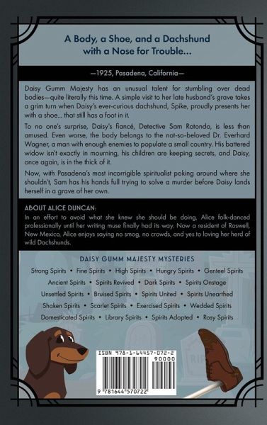 A Body, a Shoe, and a Dachshund with a Nose for Trouble... -1925, Pasadena, California- Daisy Gumm Majesty has an unusual talent for stumbling over dead bodies-quite literally this time. A simple visit to her late husband's grave takes a grim turn when Daisy's ever-curious dachshund, Spike, proudly presents her with a shoe... that still has a foot in it. To no one's surprise, Daisy's fiancé, Detective Sam Rotondo, is less than amused. Even worse, the body belongs to the not-so-beloved Dr. Everhard Wagner, a man with enough enemies to populate a small country. His battered widow isn't exactly in mourning, his children are keeping secrets, and Daisy, once again, is in the thick of it. Now, with Pasadena's most incorrigible spiritualist poking around where she shouldn't, Sam has his hands full trying to solve a murder before Daisy lands herself in a grave of her own. Alice Duncan spent years avoiding what she knew she should be doing-writing-by professionally folk dancing instead. Eventually, her muse won the battle, and she's been crafting engaging historical cozy mysteries ever since. Now a proud resident of Roswell, New Mexico, Alice enjoys the lack of smog and crowds while spoiling her beloved herd of wild dachshunds. Visit her at www.aliceduncan.net. Don't miss a moment of the action with Daisy and her cadre of friends as they solve mysteries in 1920s Pasadena! Each story stands alone but is best enjoyed in order. Strong Spirits Fine Spirits High Spirits Hungry Spirits Genteel Spirits Ancient Spirits Spirits Revived Dark Spirits Spirits Onstage Unsettled Spirits Bruised Spirits Spirits United Spirits Unearthed Shaken Spirits Scarlet Spirits Exercised Spirits Wedded Spirits Domesticated Spirits Library Spirits Spirits Adopted Rosy Spirits