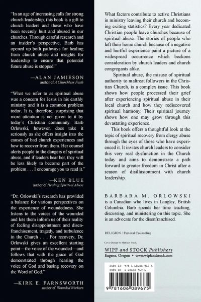 What factors contribute to active Christians in ministry leaving their church and becoming exiting statistics? Every year dedicated Christian people leave churches because of spiritual abuse. The stories of people who left their home church because of a negative and hurtful experience paint a picture of a widespread occurrence which beckons consideration by church leaders and church congregants alike. Spiritual abuse, the misuse of spiritual authority to maltreat followers in the Christian Church, is a complex issue. This book shows how people processed their grief after experiencing spiritual abuse in their local church and how they rediscovered spiritual harmony. Their spiritual journey shows how one may grow through this devastating experience. This book offers a thoughtful look at the topic of spiritual recovery from clergy abuse through the eyes of those who have experienced it. It invites church leaders to consider this very real dysfunction in the Church today and aims to demonstrate a path forward to greater freedom in Christ after a season of disillusionment with church leadership.