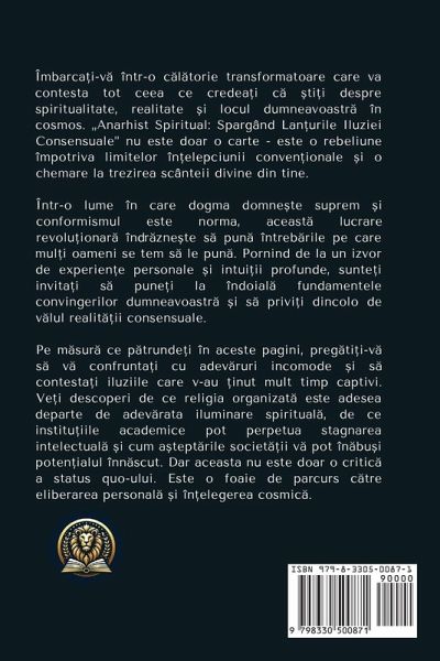 Îmbarcäi-v¿ într-o c¿l¿torie transformatoare care va contesta tot ceea ce credeäi c¿ ¿ti¿i despre spiritualitate, realitate ¿i locul dumneavoastr¿ în cosmos. "Anarhist Spiritual: Spargând Lan¿urile Iluziei Consensuale" nu este doar o carte - este o rebeliune împotriva limitelor în¿elepciunii conven¿ionale ¿i o chemare la trezirea scânteii divine din tine.Într-o lume în care dogma domne¿te suprem ¿i conformismul este norma, aceast¿ lucrare revolu¿ionar¿ îndr¿zne¿te s¿ pun¿ întreb¿rile pe care mul¿i oameni se tem s¿ le pun¿. Pornind de la un izvor de experien¿e personale ¿i intui¿ii profunde, sunte¿i invitäi s¿ pune¿i la îndoial¿ fundamentele convingerilor dumneavoastr¿ ¿i s¿ privi¿i dincolo de v¿lul realit¿¿ii consensuale.Pe m¿sur¿ ce p¿trunde¿i în aceste pagini, preg¿ti¿i-v¿ s¿ v¿ confruntäi cu adev¿ruri incomode ¿i s¿ contestäi iluziile care v-au ¿inut mult timp captivi. Ve¿i descoperi de ce religia organizat¿ este adesea departe de adev¿rata iluminare spiritual¿, de ce institu¿iile academice pot perpetua stagnarea intelectual¿ ¿i cum ätept¿rile societ¿¿ii v¿ pot în¿bu¿i poten¿ialul înn¿scut. Dar aceasta nu este doar o critic¿ a status quo-ului. Este o foaie de parcurs c¿tre eliberarea personal¿ ¿i în¿elegerea cosmic¿. Printr-un amestec de sinceritate brut¿, analiz¿ p¿trunz¿toare ¿i în¿elepciune transformatoare, ve¿i înv¿¿a s¿:- Cultiväi o conexiune direct¿ cu adev¿rurile universale care transcend dogmele religioase ¿i ¿tiin¿ifice.- S¿ identificäi ¿i s¿ v¿ eliberäi de limit¿rile autoimpuse care v¿ ¿in blocäi în mediocritate.- S¿ v¿ îmbr¿¿i¿äi calea unic¿ de cre¿tere spiritual¿, chiar dac¿ aceasta v¿ pune în dezacord cu societatea.- Explorarea sursei de în¿elepciune interioar¿ care zace latent¿ în tine.- Navigarea în peisajul complex al reläiilor umane ¿i al cre¿terii personale cu autenticitate ¿i scop.Anarhist Spiritual nu este pentru cei slabi de inim¿ sau pentru cei care se mul¿umesc cu o spiritualitate superficial¿. Este pentru c¿ut¿torii, rebelii, vizionarii care simt c¿ existen¿a este mai mult decât pare. Este pentru cei care sunt suficient de curajo¿i încât s¿ ajung¿ la limita s¿n¿t¿¿ii mintale, s¿ pun¿ totul la îndoial¿ ¿i s¿ renasc¿. Dar fi¿i avertizäi: aceast¿ carte v¿ poate pune la încercare cele mai profunde convingeri, poate provoca o reflec¿ie intens¿ asupra propriei persoane ¿i poate cataliza o transformare personal¿ profund¿. Pentru cei dispu¿i s¿ rup¿ lan¿urile iluziei consensuale ¿i s¿-¿i asume întreaga putere de co-creatori ai realit¿¿ii, recompensele sunt incomensurabile. Sunte¿i gata s¿ deveni¿i un anarhist spiritual? C¿l¿toria începe acum.
